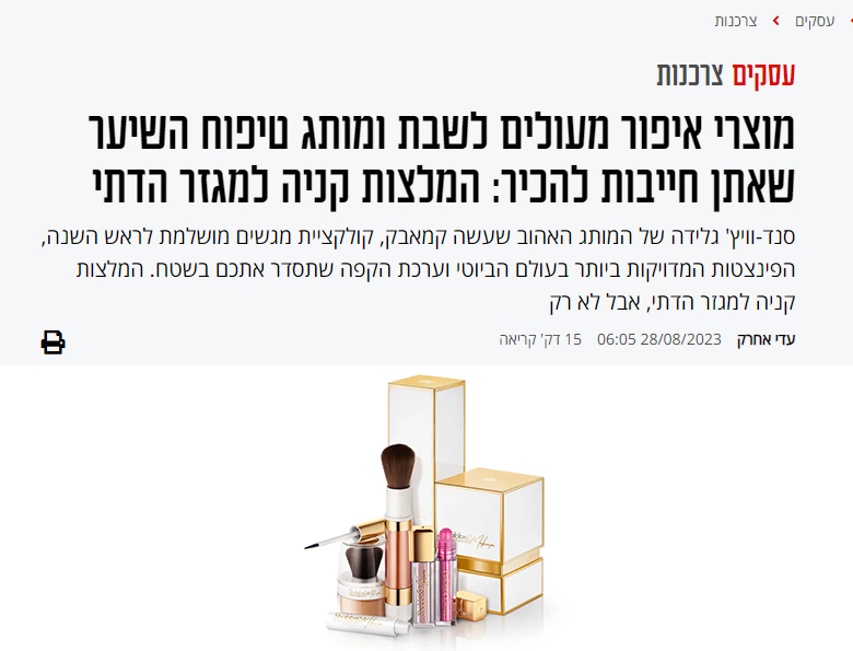 Articles Maariv Business & Consumerism View Article Every Shabbat you're a queen! View Article Erev Shavuot – Article in Pnima Magazine View Article Winning Couple View Article Daydreaming – Shabbat the Queen! View Article Article – Pnima Magazine View Article Shabbat the Queen View Article That's for sure View Article Healthy Makeup View Article Shabbat, you are the queen! View Article Healthy makeup — is there such a thing? View Article Article 1 – Em HaDerech Newspaper View Article Article 2 – Em HaDerech Newspaper View Article Article 3 – Em HaDerech Newspaper View Article Article 4 – Em HaDerech Newspaper View Article Article 5 – Em HaDerech Newspaper View Article Article 6 – Em HaDerech Newspaper View Article Crystal Fair – Come See Us Up Close A Review of the Benefits of Shabbes Makeup Gila Adler, the makeup artist, reviews Shabbes Makeup products Miri Luria